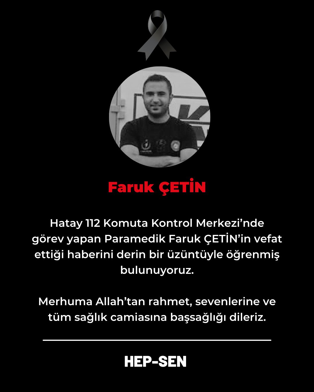 Sendika tarafından yapılan açıklamada, “Hatay 112 Komuta Kontrol Merkezi’nde görev yapan Paramedik Faruk Çetin’in vefat ettiği haberini derin bir üzüntüyle öğrenmiş bulunuyoruz. Merhuma Allah’tan rahmet, sevenlerine ve tüm sağlık camiasına başsağlığı dileriz.” ifadelerine yer verildi. – Adil Yeşildağ-