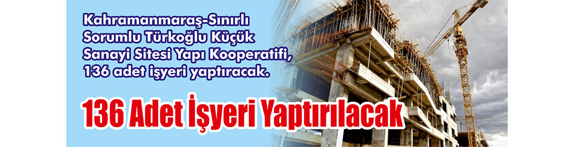 Kahramanmaraş-Sınırlı Sorumlu Türkoğlu Küçük Sanayi Sitesi Yapı Kooperatifi, 136 adet işyeri yaptıracak.