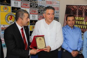 Yeni Başkan Beşir Aslan, ziyaret anısına HGC Başkanı Yetişen’e plaket verdi. -Cemil Yıldız-