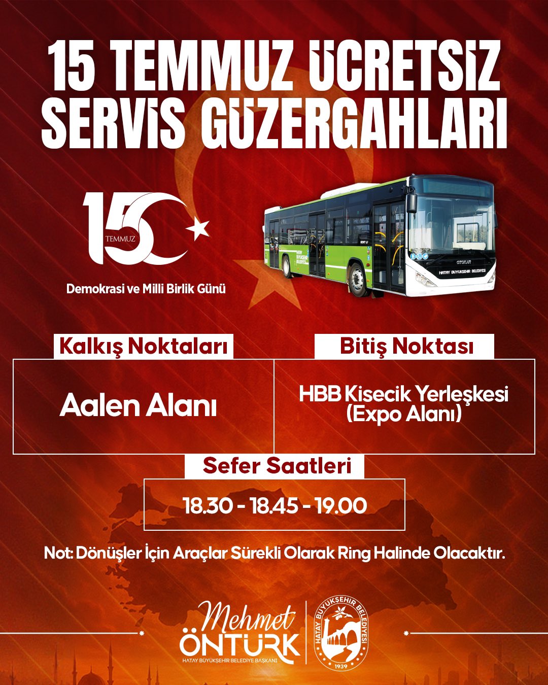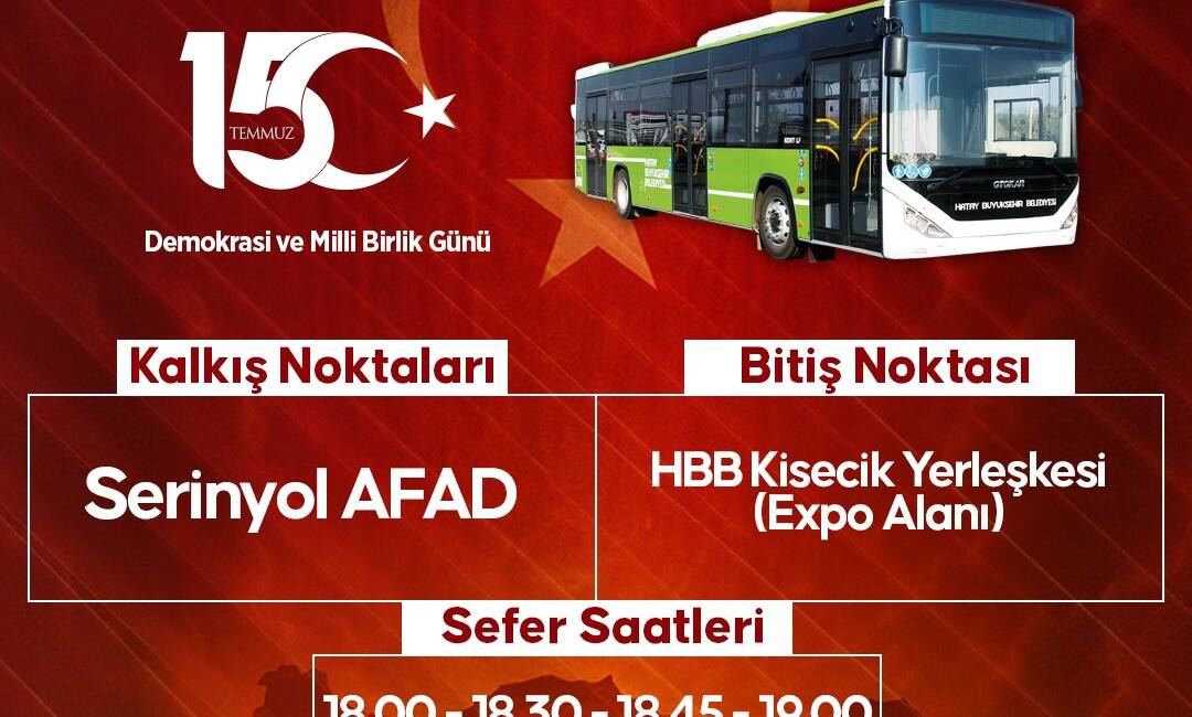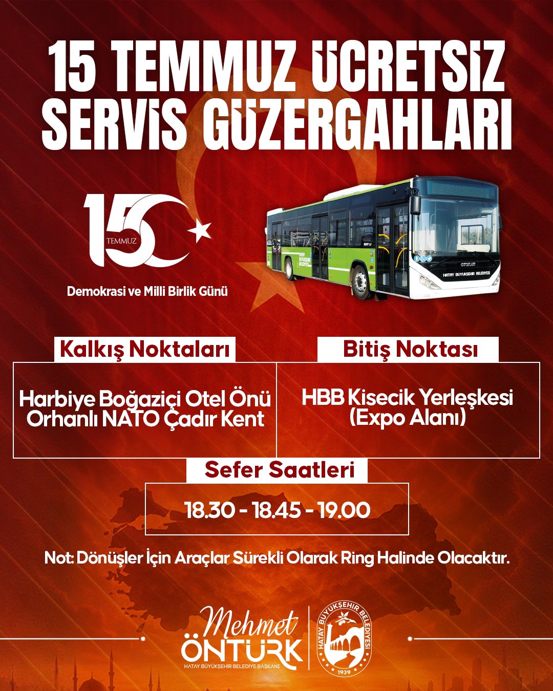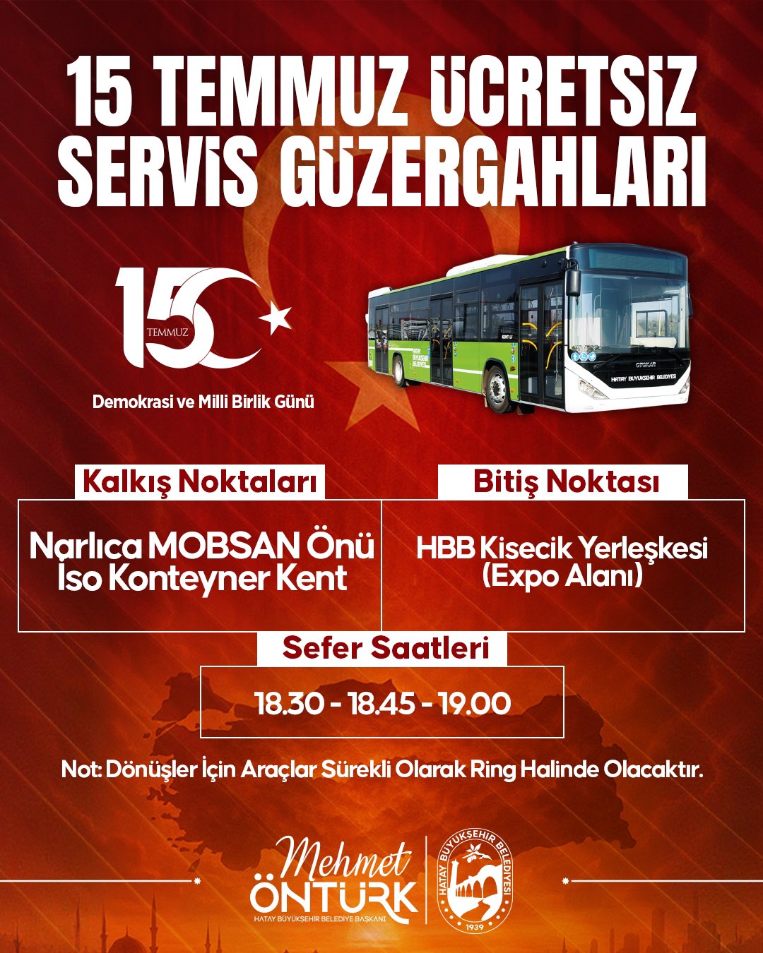 Hatay Büyükşehir Belediyesi (HBB), 15 Temmuz Demokrasi ve Millî Birlik Günü kapsamında düzenlenecek anma programına katılımı artırmak amacıyla ücretsiz servis hizmeti sunacağını duyurdu. HBB Kisecik Yerleşkesi’nde (Expo Alanı) gerçekleştirilecek program için şehrin çeşitli noktalarından vatandaşların alana kolayca ulaşabilmesi sağlanacak. Belediye Başkanı Mehmet Öntürk’ün talimatıyla organize edilen servis güzergahları ve saatleri, etkinliğe katılmak isteyen vatandaşlara yönelik olarak planlandı.