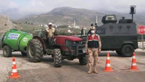 Kırıkhan’da karantinaya alınan ve giriş-çıkışlara kapatılan Ceylanlı, Karamağara ve Yalangoz Mahallelerin girişinde Jandarma ekipleri kontrol noktası oluştururken, Hatay Büyükşehir Belediyesi ve Kırıkhan Belediyesi tarafından da dezenfekte çalışmaları yapıldı. -Cemil Yıldız-
