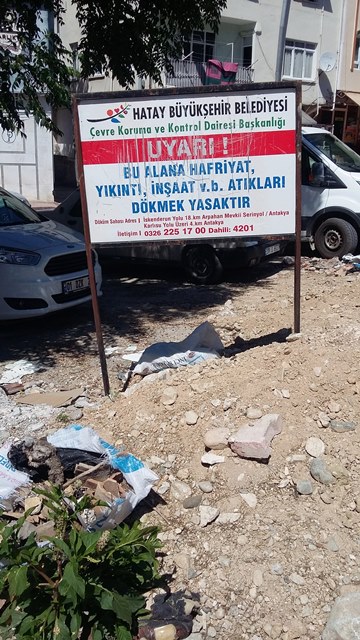 Şikayete konu alanda bulunan tek ‘resmi’ kurumsal işaretin, üzerinde ‘UYARI’ ibaresi bulunan, Hatay Büyükşehir Belediyesi Çevre Koruma ve Kontrol Dairesi Başkanlığı’na ait, “Bu alana hafriyat, yıkıntı, inşaat v.b. atıkları dökmek yasaktır” diyen bir tabela olduğuna işaret eden bir vatandaş ise şunları söyledi: