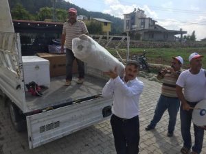 Yayladağı Belediye Başkanı Mehmet Kalkan, 21 gelin ve damat için Konya Mehir Vakfı kanalıyla getirtilen TIR dolusu beyaz eşyadan halıya, mobilyadan, tencere takımı ve altın takıya kadar çeyiz eşyaları getirtti, hediye etti.