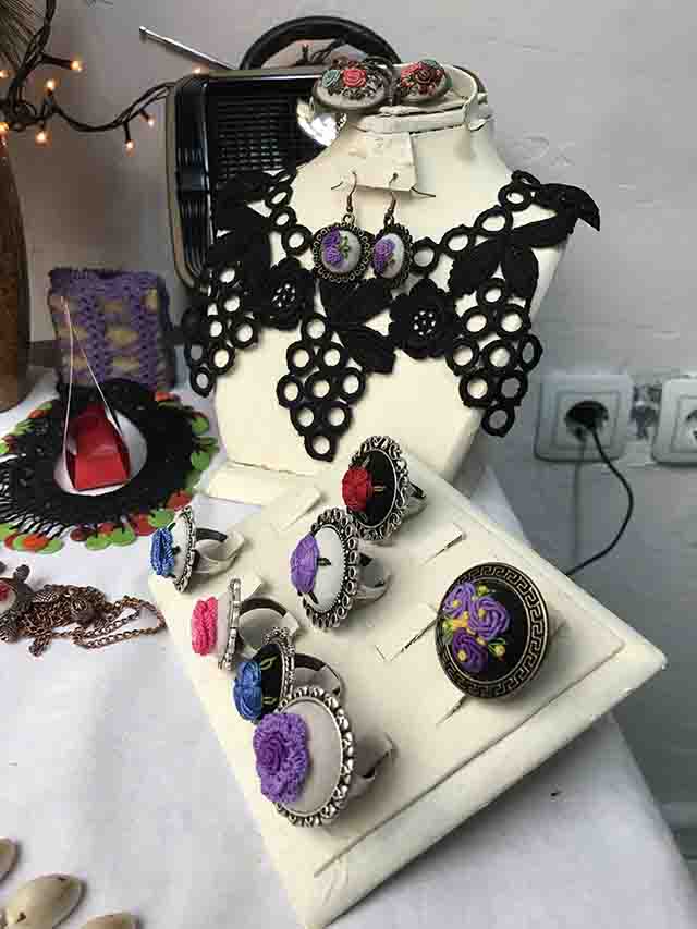 25 senedir dantel ile uğraşıyorsun, ki görüyorum, inanılmaz ürünler var dükkanında. Takılarla dantelin birleştiği yerde ise çok farklı ve estetik işler ortaya koymuşsun. Bu, inanılmaz bir ustalık.