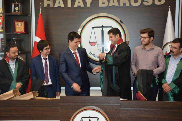 Muhammed Altınışık’a cübbesini Baro Başkanı Av. Ekrem Dönmez, Yusuf Çapa’ya cübbesini Av. Erman Solağan, Ömer Osman Torun’a ise cübbesini Av.