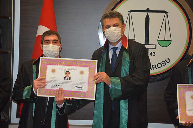 Hakan Öktem ve Ertuğrul Kara’ya cübbelerini Baro Başkanı Av. Ekrem Dönmez, İsmail Kılıçlar’a cübbesini Başkan Av. Ekrem Dönmez ve Başkan Yardımcısı Av. Sevinç Çakıcı giydirdi. Törene; Başkan Yardımcısı Av. Sevinç Çakıcı, Yönetim Kurulu üyesi Av. Hüseyin Derin, meslektaşı Av. Saadet Özal ve yemin eden meslektaşların aileleri katıldı.