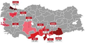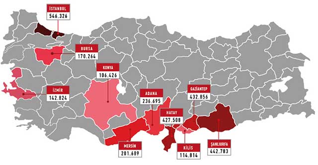 Listenin ilk sırasında İstanbul bulunurken; Şanlıurfa’da 441 bin 792 Suriyeli sığınmacı, Gaziantep’te 433 bin 664 Suriyeli sığınmacı, Hatay’da 426 bin 869 Suriyeli sığınmacı, Adana’da 237 bin 280 Suriyeli sığınmacı, Mersin’de 201 bin 189 Suriyeli sığınmacı, Bursa’da 170 bin 705 Suriyeli sığınmacı, İzmir’de 142 bin 995 Suriyeli sığınmacı, Kilis’te 114 bin 797 Suriyeli sığınmacı, Konya’da 106 bin 312 Suriyeli sığınmacı, Ankara’da 91 bin 422 Suriyeli sığınmacı, Kahramanmaraş’ta 87 bin 201 Suriyeli sığınmacı, Mardin’de 87 bin 96 Suriyeli sığınmacı, Kayseri’de 77 bin 781 Suriyeli sığınmacı, Kocaeli’de 56 bin 684 Suriyeli sığınmacı, Osmaniye’de 48 bin 572 Suriyeli sığınmacı, Diyarbakır’da 33 bin 547 Suriyeli sığınmacı, Malatya’da 29 bin 713 Suriyeli sığınmacı ve Adıyaman’da 24 bin 477 Suriyeli sığınmacı bulunuyor.