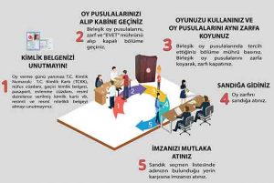Büyükşehir Belediye Başkanlığı seçimi için kullanılacak oy pusulası “beyaz”, büyükşehir olmayan illerde “turuncu”, ilçe belediyesi için hazırlanan oy pusulası “mavi”, belediye meclis üyeliği için kullanılacak oy pusulası ise “sarı” renkte olacak. Seçmenler, “Evet” veya “Tercih” yazılı mühürlerle oylarını kullanacak. Oy pusulalarının üzerine mühür dışında yazı yazılmayacak. Oy pusulaları tek zarfa konulacak. Zarflar, şeffaf sandıklara atılacak.