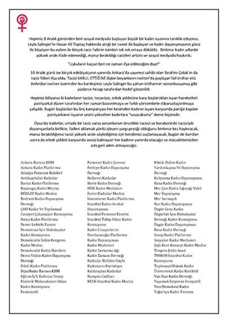 Oysa biz kadınlar, ortada bir taciz varsa; sorumlunun öncelikle tacizci ve beraberinde tacizciyle dayanışanlarla birlikte, failleri aklamak yönlü işleyen yargı pratiği olduğunu binlerce kez haykıracak, maruz bırakıldığımız tacizi yüksek sesle söylediğimiz için kendimizi suçlamayacak, bugün de ve bundan sonra da erkek şiddeti karşısında sessiz kalmayan her kadının yanında olacağız, mücadelemizden de asla geri adım atmayacağız.”