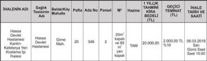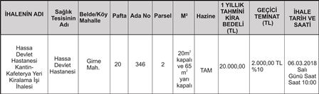 Müdürlüğümüze bağlı Hassa Devlet Hastanesine ait olan aşağıda belirtilen taşınmazlar, 2886 sayılı Kanunun 45. maddesi gereğince açık teklif usulü ile 36 Ay süreli kantin/kafeterya olarak kullanılmak üzere kiraya verilecektir.