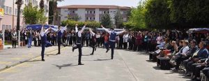 Okul öğrencilerinin folklor gösterisi sunumu ardından, okul bahçesinde, okul öğretmenleri ve