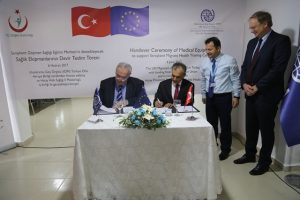 Konuşmaların ardından sağlık ekipmanlarının teslimiyle ilgili protokol imzalandı. Günde ortalama 300 göçmene sağlık hizmeti verilen merkeze AB tarafından 220 bin avro değerinde tıbbi cihaz alındığı, bu ekipmanlar aracılığıyla Hatay’da yaşayan 380 bini aşkın Suriyeli göçmene sağlık hizmeti veren birimlerin omuzundaki yükün hafifletilmek istendiği bildirildi. Ekipmanın, göçmenlere sağlık hizmetlerinin kendi dillerinde verilebilmesi için ders alan Suriyeli tıp personelinin eğitiminde kullanılacağı kaydedildi. Şu ana kadar toplam 368 Suriyeli doktor ve 320 hemşirenin eğitimlerini tamamladığı ve ülkenin farklı bölgelerindeki göçmen sağlık merkezlerinde görevlendirildiği öğrenildi. -AA-
