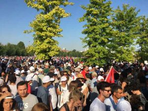 İstanbul’un dört bir köşesinden, ülkemizin her şehrinden insanlar özel çağrı almadan gönüllü olarak aktı miting alanına, metrodan çıktığımızda görevliler insanları yönlendiriyordu ve kimsede telaş yoktu, Pazar pikniğe gider gibi neşe içindeydi herkes.