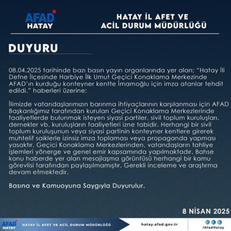 Hatay’ın Defne ilçesinde bulunan Harbiye İlk Umut Geçici Konaklama Merkezi’nde, Ekrem İmamoğlu’na destek veren vatandaşların konteyner kentlerden çıkarılacağına yönelik tehdit mesajlarına AFAD Hatay İl Müdürlüğü açıklama yaptı. İddialara ilişkin yazılı bir açıklama yapan AFAD Hatay, paylaşılan mesajın herhangi bir kamu görevlisi tarafından paylaşılmadığını belirtti.