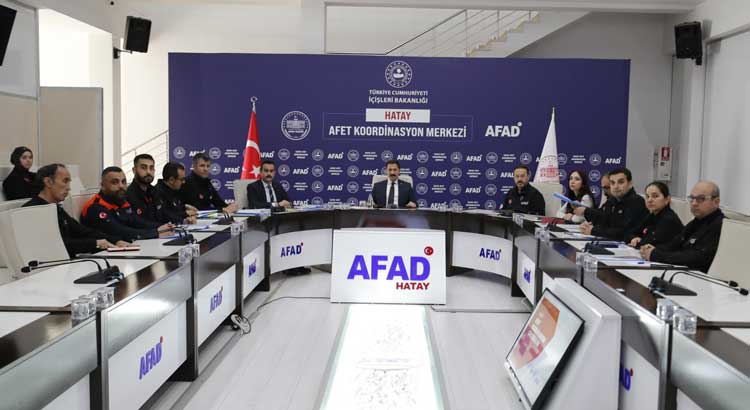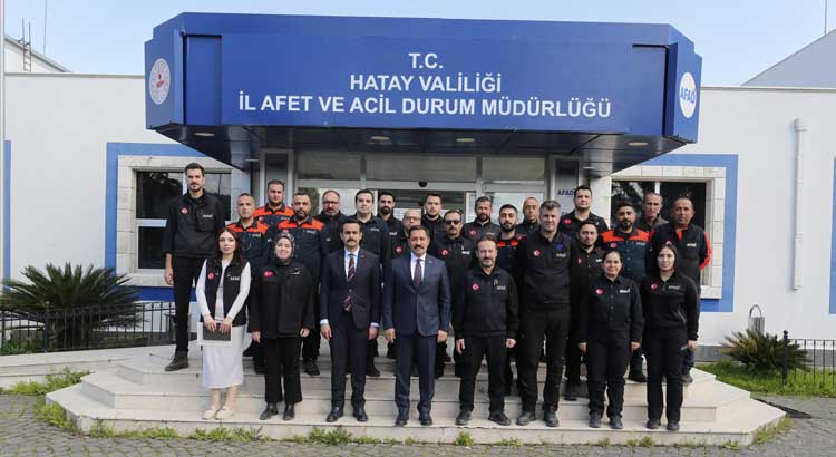 Hatay Valisi Mustafa Masatlı, AFAD İl Müdürlüğü’nde görevli yönetici ve arama-kurtarma personeline rütbe işaretlerini takarak başarı belgelerini takdim etti.