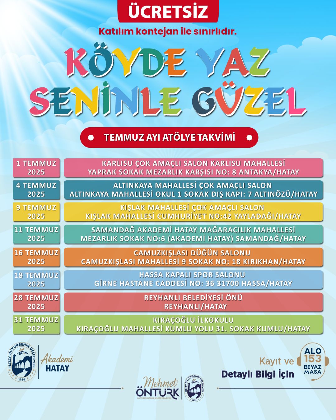 Hatay Büyükşehir Belediyesi (HBB), yaz tatilini kırsal bölgelerdeki çocuklar için unutulmaz bir deneyime dönüştürüyor. HBB İnsan Kaynakları ve Eğitim Dairesi Başkanlığı bünyesinde faaliyet gösteren Akademi Hatay, “Köyde Yaz Seninle Güzel” temasıyla Temmuz ayı boyunca ücretsiz etkinlikler düzenleyecek.