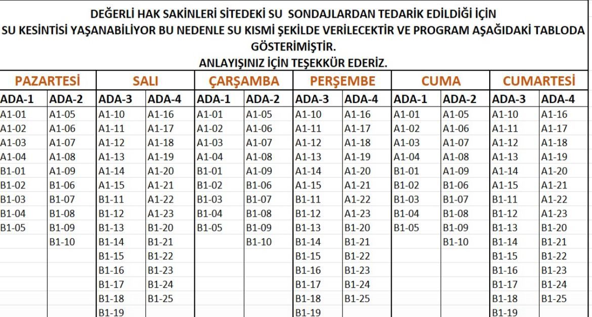 Yaklaşık 1000 konutun bulunduğu bölgede, sular haftanın büyük bir bölümünde tamamen kesik. Sadece 1-2 günlüğüne kısa süreli su verilmesiyle yaşam neredeyse imkânsız hâle gelmiş durumda. Vatandaşlar, temel hijyen, temizlik ve günlük ihtiyaçlarını karşılayamaz hâle geldi.