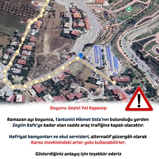 “Ramazan ayı boyunca, Tantunici Hikmet Usta’nın bulunduğu noktadan Zeytin Kafe’ye kadar olan cadde araç trafiğine kapalı olacaktır. Hafriyat kamyonları ve okul servisleri, alternatif güzergâh olarak Karsu mevkisindeki arter yolunu kullanabilirler. Gösterdiğiniz anlayış için teşekkür eder, hayırlı Ramazanlar dileriz.”