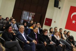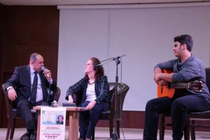 Söyleşide, zaman zaman Hatay Bedii Sabuncu Güzel Sanatlar Lisesi öğrencisi Merih Nafile’nin çalıp seslendirdiği türkülerle duygulu anlar yaşandı.