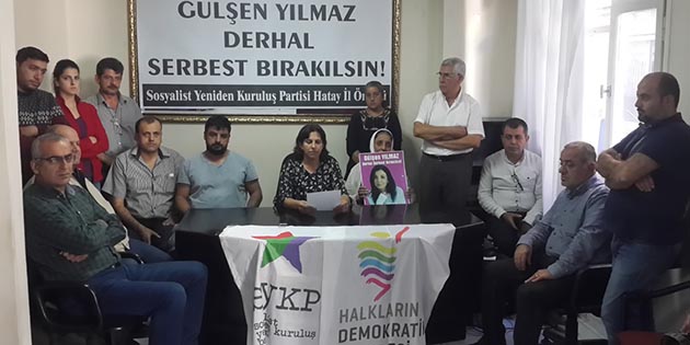 SYKP’de dün düzenlenen basın açıklamasında, bir anne, gözaltına alınan kızı Gülşen Yılmaz’ın suçsuz olduğunu ve serbest bırakılmasını isterken, iki gündür kızının gözaltında olması dolayısıyla gözyaşlarını tutamadı. Anne, elinde kızının fotoğrafı ile bu açıklamayı yaparken, SYKP İl Eşbaşkanı Hülya Kavuk da, Parti üyesi Gülşen Yılmaz’ın Hollanda’da yaşadığını ve hasta babasını ziyaret emek üzere ülkeye geldikten sonra yakalanıp gözaltına alındığını kaydederek, “Arkadaşımız suçsuzdur, serbest bırakılmalı” dedi. -Cemil Yıldız-