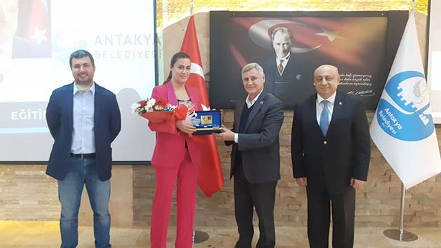 Antakya Belediye Başkanı İzzettin Yılmaz’ın Bakanlıklar nezdinde görüşmelerde bulunmak üzere Ankara’da olması nedeniyle, Başkan Yılmaz adına, Başkan Vekili Ömer Gürbüz ve Başkan Yardımcısı Orhan Mursaloğlu tarafından, katkılarından dolayı, İGEME Business School’un Eğitim Uzmanları İmer Katioğlu ve Dr. Sadık Vural’a teşekkür plaketi takdim edildi.” -Yusuf Cemil Karaçay-
