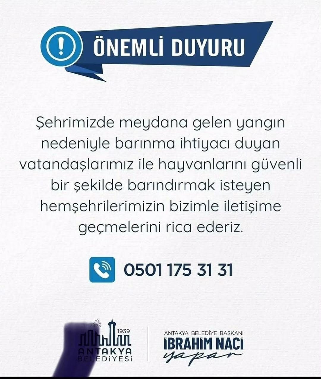 Hatay’ın çeşitli bölgelerinde etkili olan orman yangınları sonrası Antakya Belediyesi’nden önemli bir çağrı geldi. Yangın nedeniyle barınma ihtiyacı duyan vatandaşlar ve hayvanlarını güvenli şekilde yerleştirmek isteyenler için belediye tarafından destek sağlanacağı açıklandı.