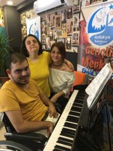 Tüm bunların yanı sıra, engelli gençlerimizin de kurslarımızdan faydalanmalarını, kendilerini soyutlanmış değil aksine toplumun bir parçası olarak hissetmelerini sağlamak, psikolojik ve fiziksel olarak gelişimlerine katkıda bulunmayı amaçlıyoruz. Geçtiğimiz süreçte, zihinsel engelli kursiyerlerimize piyano ve şan dersleri verdiğimiz Antakya Belediyesi Gençlik Merkezimizde, son olarak görme engelli gençlerimize yönelik piyano eğitimi ile hizmetimize devam ediyoruz. Piyano eğitmenlerimiz Burcu Çilingir ve Esra Erdem eşliğinde verilen kurslarımızda engelli öğrencilerimiz kendilerini geliştiriyor. Ayrıca el koordinasyonlarını ilerletmelerini, böylece iyi bir kontak sağlamalarını ve konsantrasyonlarını arttırmalarını amaçlıyoruz. Bu eğitimi alan öğrencilerimizin okul başarısı, özgüven ve hafızayı kuvvetlendirmesi gibi pozitif etkisi olduğunu görmek