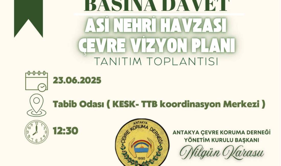 Antakya Çevre Koruma Derneği, Asi Nehri Havzası’nı merkeze alan çevre politikalarının tartışılacağı önemli bir tanıtım toplantısına hazırlanıyor. “Asi Nehri Havzası Çevre Vizyon Planı” başlığıyla düzenlenecek toplantı, 23 Haziran 2025 Pazartesi günü saat 12.30’da, Tabip Odası (KESK-TTB Koordinasyon Merkezi) ev sahipliğinde gerçekleştirilecek.