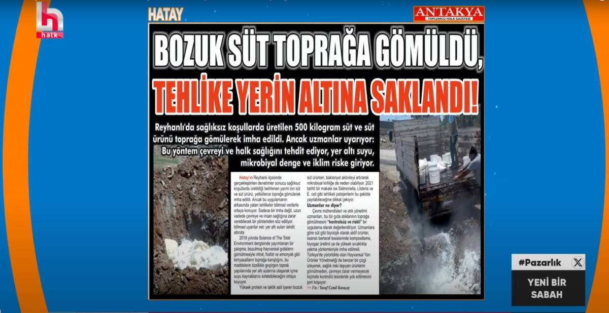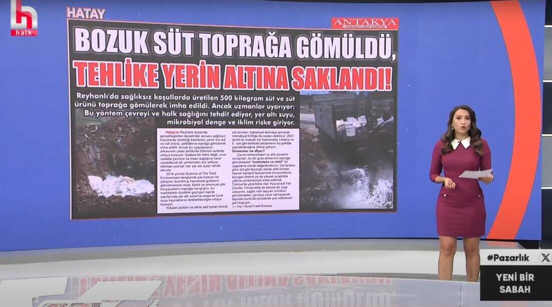 Antakya Toplumcu Halk Gazetesi’nin “Bozulmuş süt toprağa gömüldü, peki ya sonra?” başlıklı manşeti, kısa sürede kamuoyunun dikkatini çekti. Konu, Halk TV’de Gözde Şeker’in sunduğu “Yeni Bir Sabah” programında da gündeme getirildi. Şeker, söz konusu manşeti canlı yayında izleyicileriyle paylaştı ve haberin içerdiği çevre sağlığı vurgusuna dikkat çekti.
