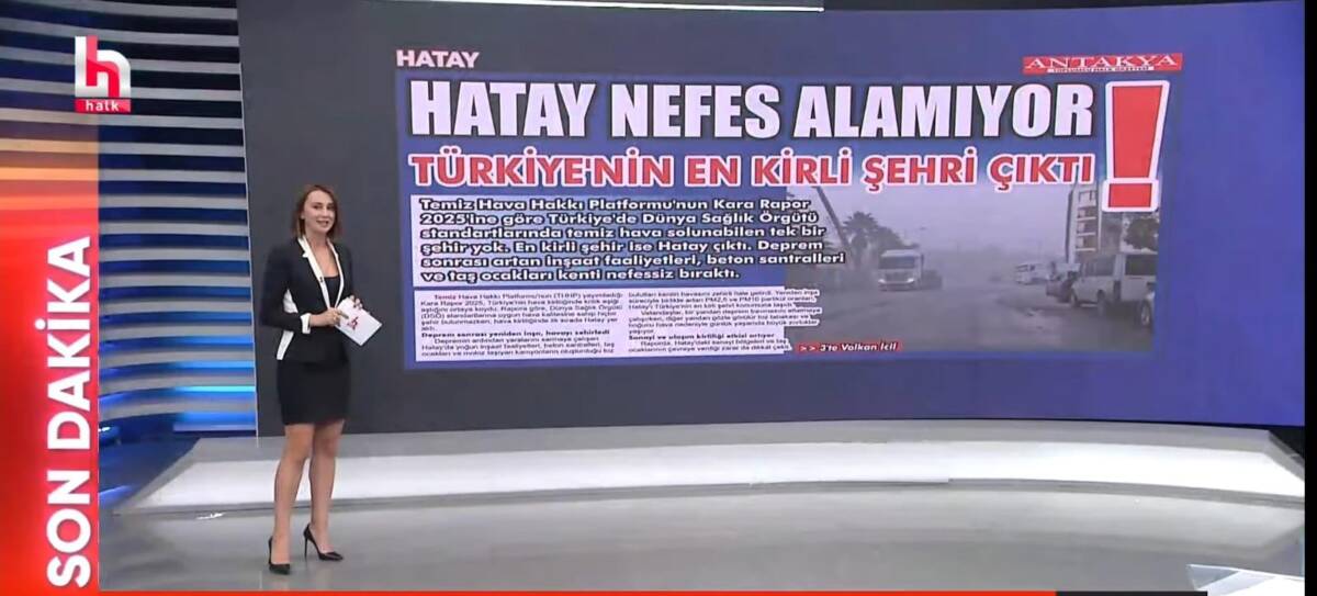 Halk TV’de Süheyla Demir, Antakya Gazetesi’nin bu manşetini canlı yayında paylaşarak, yerel basının uyarılarını ulusal kamuoyuna taşıdı. Temiz Hava Hakkı Platformu’nun raporuna göre Hatay’da yıllık partikül madde (PM2.5) oranı DSÖ sınır değerinin birkaç kat üzerinde. Uzmanlar, bölgede hava kalitesinin iyileşmesi için inşaat ve sanayi faaliyetlerinin denetlenmesi, beton santrallerine filtre zorunluluğu getirilmesi ve yeşil alanların artırılması gerektiğini vurguluyor.