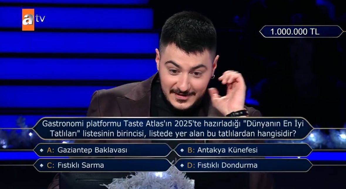 ATV’de yayınlanan “Kim Milyoner Olmak İster? Yılbaşı Özel” programında Antakya’nın dünyaca ünlü lezzeti peynirli künefe, 1 milyon TL’lik soruya konu oldu. Ancak yarışmacı, doğru cevabı veremeyince büyük ödülün sahibi olamadı.
