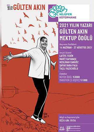 Katılımın rumuz ile yapılacağı ödüle, dosya halinde iki mektup ile başvuru yapılması gerekiyor. Mektup Ödülü’ne başvurmak isteyenler başvuru formunu, Nilüfer Belediyesi’nin tüm kütüphanelerinden, www.nilufer.bel.tr veya Nilüfer Kütüphane sosyal medya adreslerinden bilgisayar çıktısı olarak temin edebilecek. “2021 Yılın Yazarı: Gülten Akın Mektup Ödülü”nde büyük ödül 3 bin TL olacak. Ayrıca bin TL değerinde 5 mansiyon ödülü de verilecek. (Cumhuriyet)