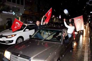 Sağanak yağmura rağmen, ”Şehitler ölmez vatan bölünmez” sloganları atarak yürüyen gruba, çok sayıda kişi arabalarıyla eşlik etti.
