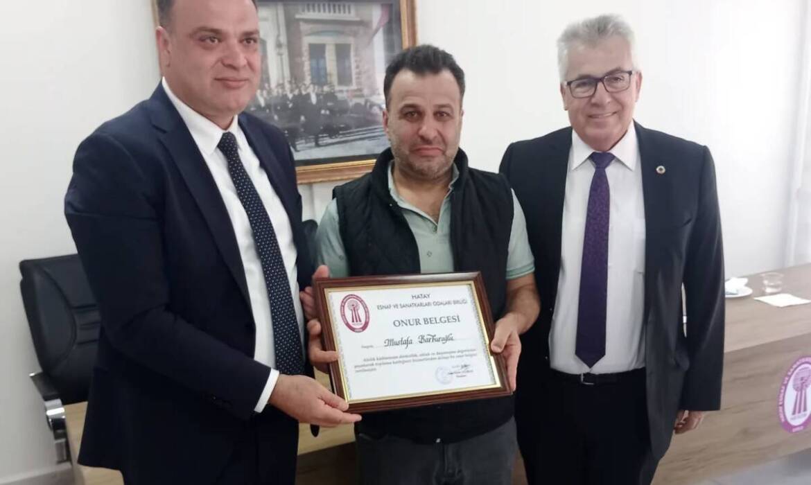 Hatay Antakya-İstiklal Caddesi’nde yıllarca manav ve iletişim sektöründeki işyerleriyle Antakyalılara hizmet veren kentin eski esnaflarından Mustafa Barburoğlu’na, Hatay Esnaf ve Sanatkârlar Odaları Birliği (HESOB) tarafından Onur Belgesi takdim edildi.