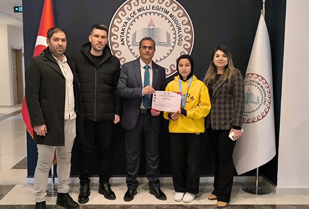 Türkiye şampiyonluğu sonrası Elif Nisa Karakuş; Okul Müdürü Ayşe Gül Çolakoğlu, Müdür Yardımcısı Aybey Kopmaz ve Okul Aile Birliği Başkanı Önder Demirkol ile birlikte Antakya İlçe Millî Eğitim Müdürü Ahmet Tecimen’i makamında ziyaret etti.
