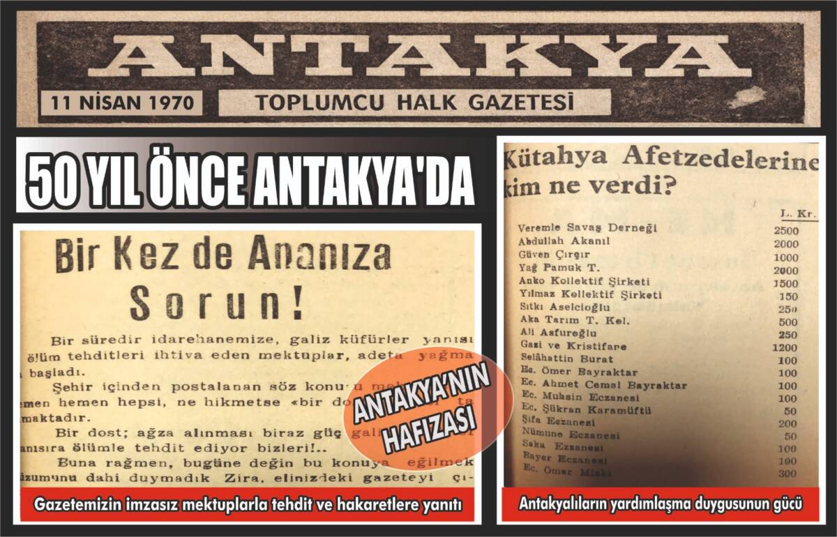 Arşiv niteliği taşıyan bu sayfa, bir yandan 1970’li yıllarda yerel basının karşı karşıya kaldığı zorlukları yansıtırken, diğer yandan Antakya halkının toplumsal duyarlılığını ve ortak acılar karşısındaki birlikteliğini belgeleyen önemli bir kaynak olarak öne çıkıyor.