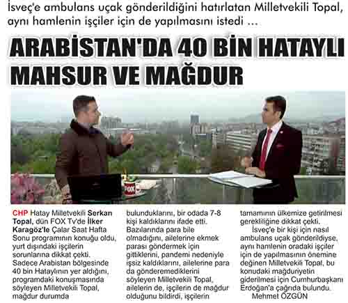 CHP Hatay Milletvekili Serkan Topal, geçen hafta FOX TV canlı yayınında yaptıkları çağrıya yetkililerin duyarsız kalmadığını söyledi ve hasta vatandaşımızı ülkemize getirmek üzere Suudi Arabistan’a ambulans uçak gönderildiğini ifade etti.