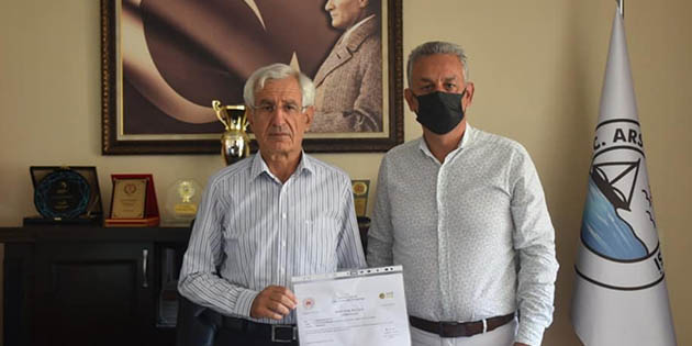 Belgeyi, Çevre ve Şehircilik İl Müdürü, Arsuz Belediye Başkanı Asaf Güven’e takdim etti. -Duygu Ertaş-