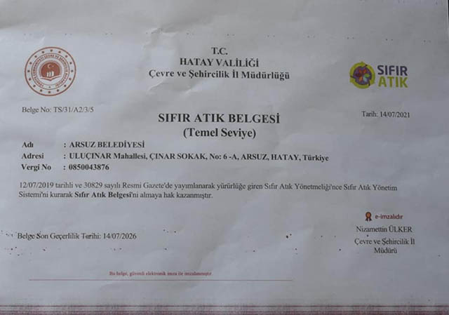 Çevreci Çalışmalar ve Sıfır Atık Projesi kapsamında, Arsuz Belediyesi’nde yürütüldüğü belirtilen yatırımlar neticesinde, Belediyeye, Çevre ve Şehircilik İl Müdürlüğü tarafından “Sıfır Atık” belgesi verildi. İsrafın önlenmesi, doğal varlıkların korunması, çevre dostu tüketim alışkanlıkların kazandırılmasına yönelik gerçekleştirilen çalışmaların neticesinde bu belgenin alındığı kaydedilerek; cam, kağıt, plastik, metal ve benzeri atıkların yerinde ayrıştırılması ve geri kazandırılmasının hedeflendiği bildirildi.