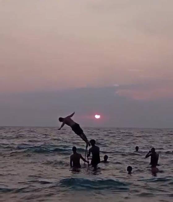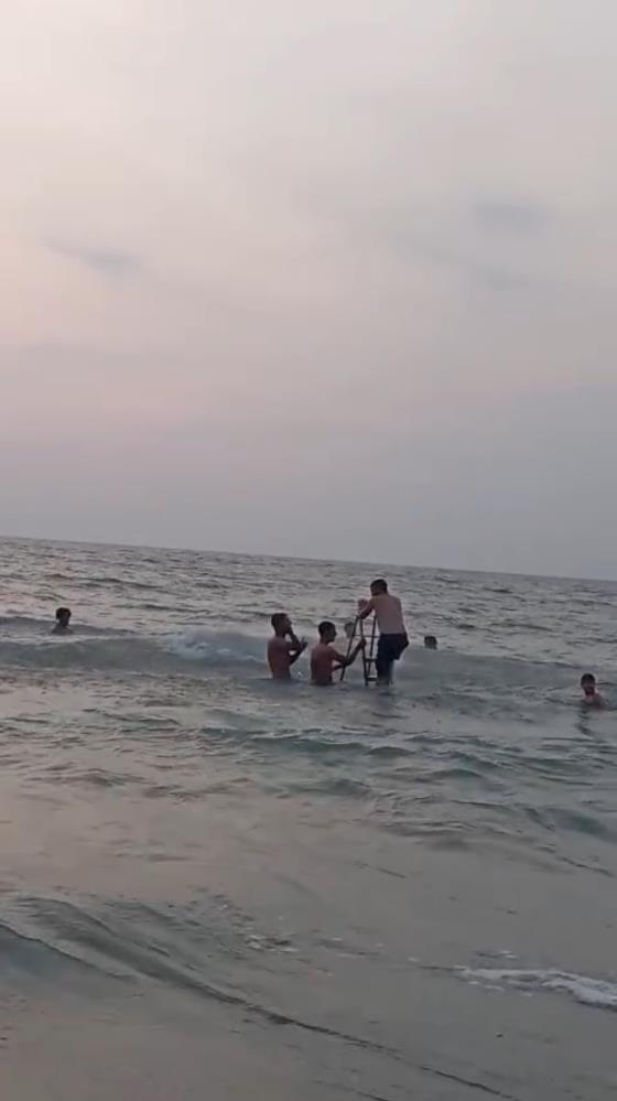 Hatay’ın Arsuz ilçesine bağlı Karaağaç sahilinde, sıcak yaz günlerinde serinlemek isteyen gençler, sıradışı bir eğlenceye imza attı. Yanlarında getirdikleri merdiveni denizin ortasına kuran gençler, bu platform üzerinden atlayarak denizin tadını doyasıya çıkardı.