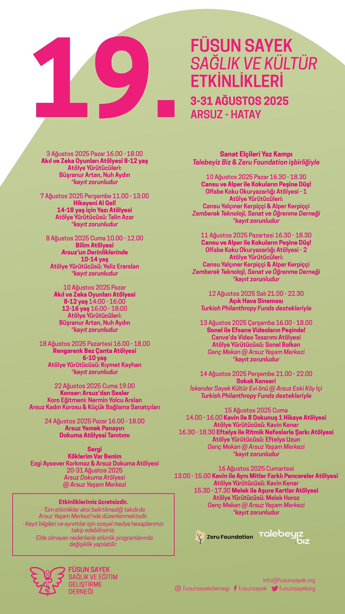 Füsun Sayek Sağlık ve Eğitim Geliştirme Derneği’nin öncülüğünde Arsuz Yaşam Merkezi’nde gerçekleşecek etkinlikler serisi; yıl boyunca hazırlanan Kadın Korosu, çocuk atölyeleri, dokuma stüdyosu ve Sanat Elçileri gençlerinin çalışmaları ile şekilleniyor.