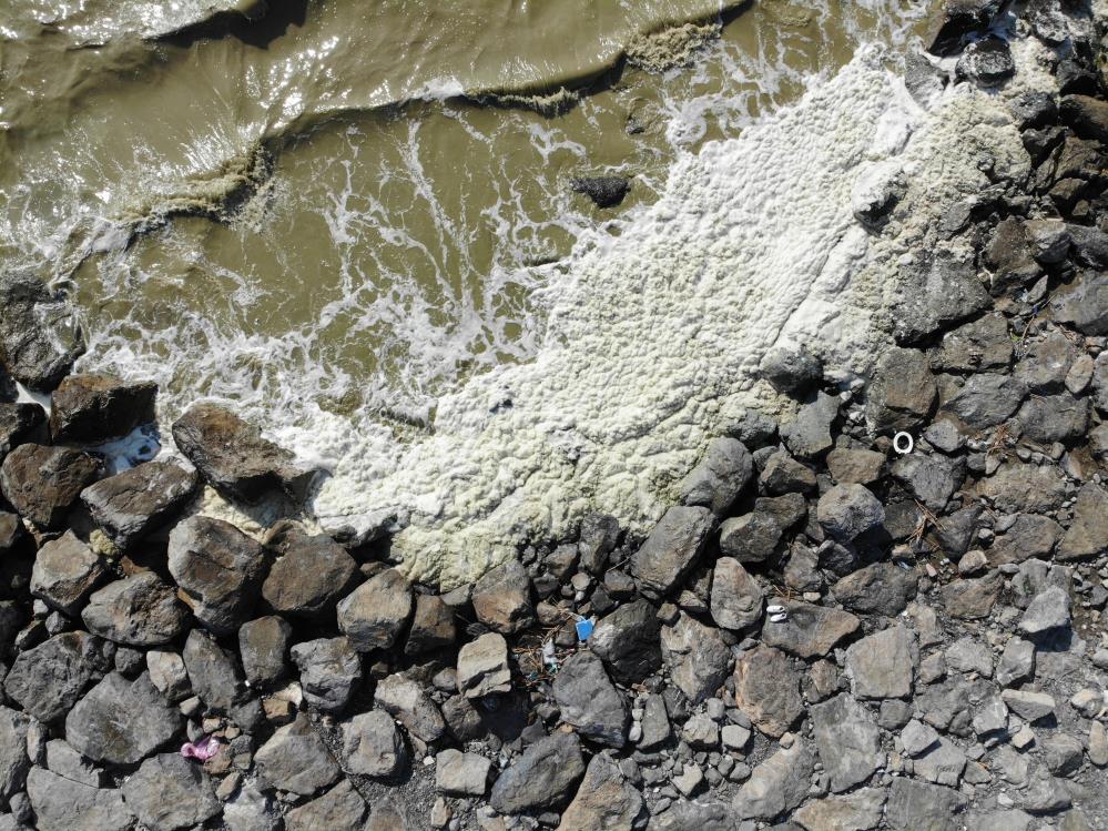 Hatay’ın Arsuz ilçesi sahilinde deniz yüzeyinde oluşan beyaz ve köpüksü