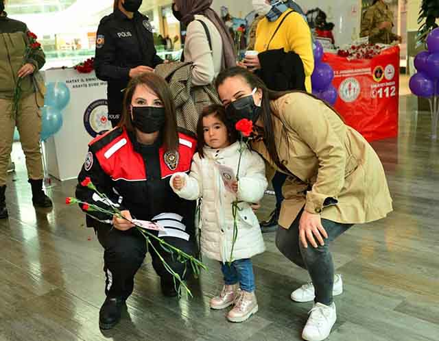 Emniyet Müdürlüğü yöneticileri, 8 Mart Dünya Kadınlar Günü kapsamında, Palladium Alışveriş Merkezi’nde Kadın Polis memurlarının kadınlarımızın Kadınlar Günü’nü kutlayarak karanfil dağıttığını kaydederek, KADES uygulaması ile ilgili broşürlerin de etkinlik kapsamında paylaşıldığını bildirdiler. -Selvi Günay-
