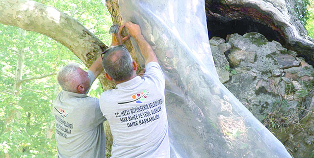 HBB ekipleri, Sarıseki Mahallesi Haymaçınar Yaylası’nda bulunan ve 900 ile 1000 yaşları arasında olduğu tahmin edilen çınar ağacına müdahalede bulunarak koruma altına aldı.
