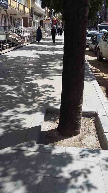 “65 yaşındayım ve ben bile, kaldırımlardan inerken de çıkarken de dikkat ediyorum. Çünkü kimi yerlerde çok keskin inişler ve çıkışlar var. Yola inen ya da yoldan kaldırıma çıkan kısımların, belli bir eğimde olması gerekiyor ama… Yeni yapmamıza rağmen, eski neyse, bugünkü yeni de o! Bir de halimiz değişmiyor. Birçok ağacın dibi atılan çöplerle kirletiliyor. Buraları da bir şekilde kapatsalar aslında. Ya çimlendirsinler ya da İstanbul’da yaptıkları gibi, demir ızgaralarla bir şekilde örtsünler. Ama estetik bir şekilde…”