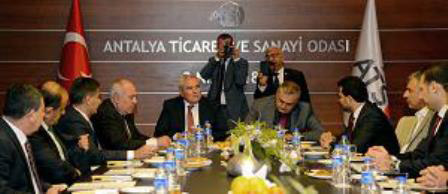 Antakya Ticaret ve Sanayi Odası (ATSO) Başkanı, Meclis Başkanı ve yöneticilerden oluşan bir heyet Antalya Ticaret ve Sanayi Odası’nı (ATSO) ziyaret etti. Antalya ATSO adına görüşmeye Yönetim Kurulu Başkanı Davut Çetin, Başkan Yardımcısı Mustafa İssi ve Yönetim Kurulu Üyesi Ayhan Kızılsavaş, Antakya ATSO adına Başkan Hikmet Çinçin, Meclis Başkanı Selahattin Eskiocak ve Meclis üyeleri katıldı. ATSO heyetine Antalya ekonomisi, EXPO 2016, Oda çalışmaları ve projeleri hakkında bilgi verildi. Hatay’da düzenlenecek EXPO için tecrübelerini her zaman paylaşmaya açık olduğunu belirten Antalya TSO Başkanı Davut Çetin, “EXPO için Antalya kenti olarak uzun zaman emek verdik. Yaşanan talihsizlikler olmasaydı EXPO çok farklı yerlerde olabilirdi. Ancak umuyorum ki Hatay’da düzenlenecek EXPO arzu edilen seviyeye gelecektir. Bizler de bu konuda elimizden gelen tüm desteği sonuna kadar vermeye hazırız” dedi.