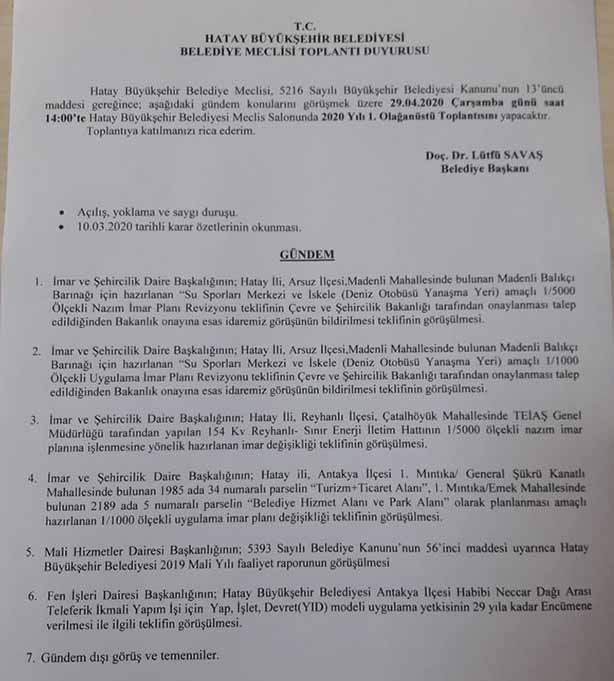 Geçtiğimiz günlerde bir açıklama yapan ve Belediye Meclis Toplantısı için çağrıda bulunan Hatay Büyükşehir Belediye Başkanı Lütfü Savaş, “Büyükşehir Belediye Meclisi, 5216 sayılı Büyükşehir Belediyesi Kanunu’nun 1. Maddesi gereğince, gündem konularını görüşmek üzere 29.04.2020 Çarşamba günü saat 14.00’da, Hatay Büyükşehir Belediyesi Meclis Salonu’nda 2020 Yılı 1. Olağanüstü Toplantısı’nı yapacaktır” dedi. 4 teklif görüşmesi, 2 imar planı değişikliği ile 2019 Mali Yılı Faaliyet Raporu’nun gündem maddeleri arasında yer aldığı Meclis Toplantısı için yapılan bilgilendirmeyi eleştiren isim, Antakya Ticaret ve Sanayi Odası (ATSO) Başkanı Hikmet Çinçin oldu.