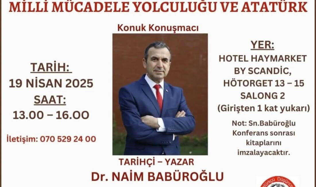 Gazetemiz yazarı ve hemşehrimiz Dr. Naim Babüroğlu, 19 Nisan Cumartesi günü İsveç’in Stockholm kentinde önemli bir etkinliğe katılacak. Tarihçi, yazar ve strateji uzmanı olan Emekli Tuğgeneral Babüroğlu, Stockholm Hotel Haymarket Scandic’te “Milli Mücadele Yolculuğu ve Atatürk” konulu bir konferans verecek.