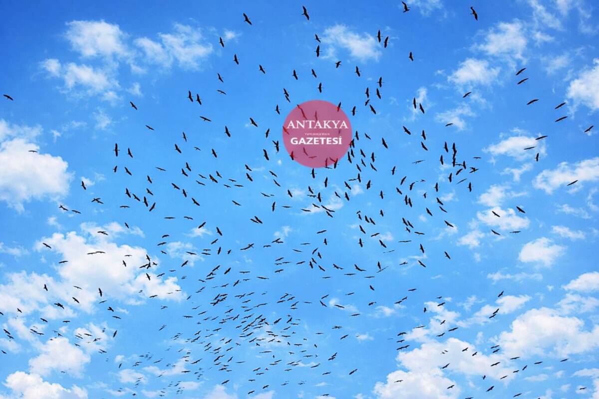 Göçmen kuşların sıcak hava akımlarını kullanarak sürü halinde yükselmesi ve birlikte hareket etmesi gökyüzünde adeta görsel bir şölen oluşturdu. Hatay semalarında oluşan bu manzara, doğaseverlerin de ilgisini çekti.