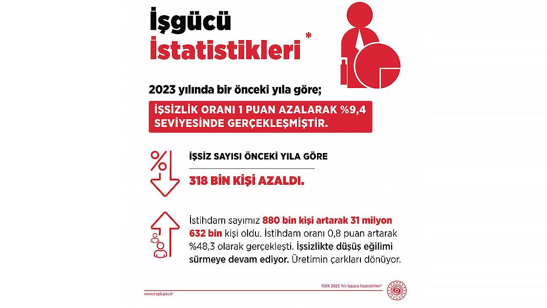 Çalışma ve Sosyal Güvenlik Bakanı Vedat Işıkhan, sosyal medya hesabında, Türkiye İstatistik Kurumunun (TÜİK) 2023 yılına ait İş Gücü İstatistikleri’ne dair paylaşımda bulundu.